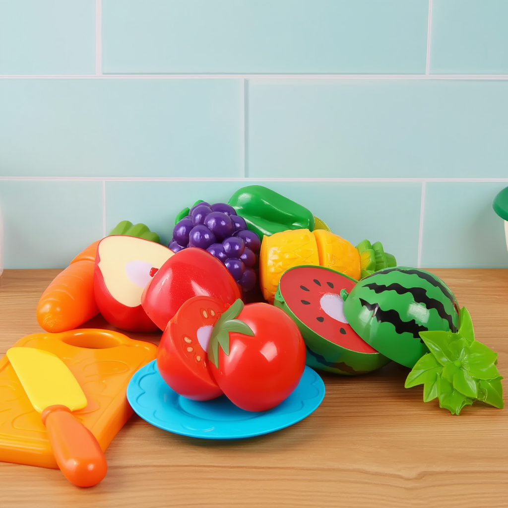 Warzywa są połączone rzepem, dzięki czemu dziecko może je „przekroić” i złożyć z powrotem – zupełnie jak prawdziwe.